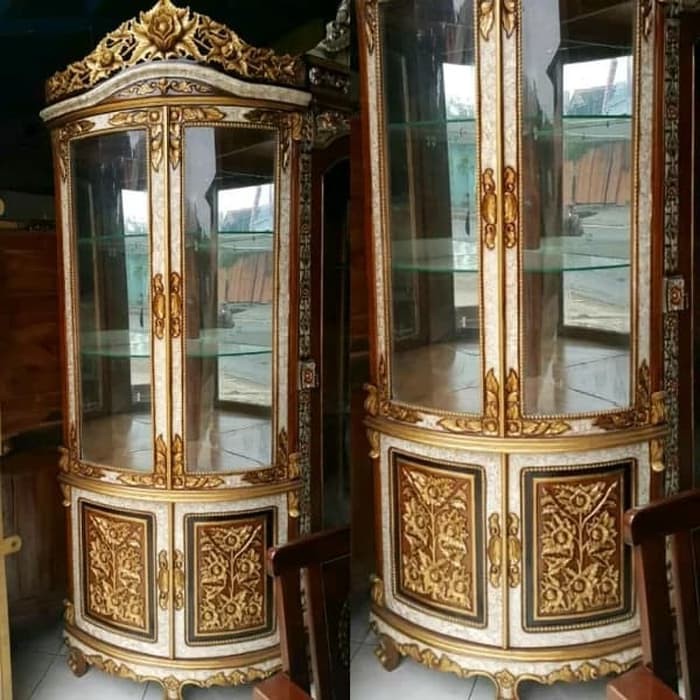 Lemari Hias Sudut Tambang Cat Putih Emas Hiasan Ukiran Lemari