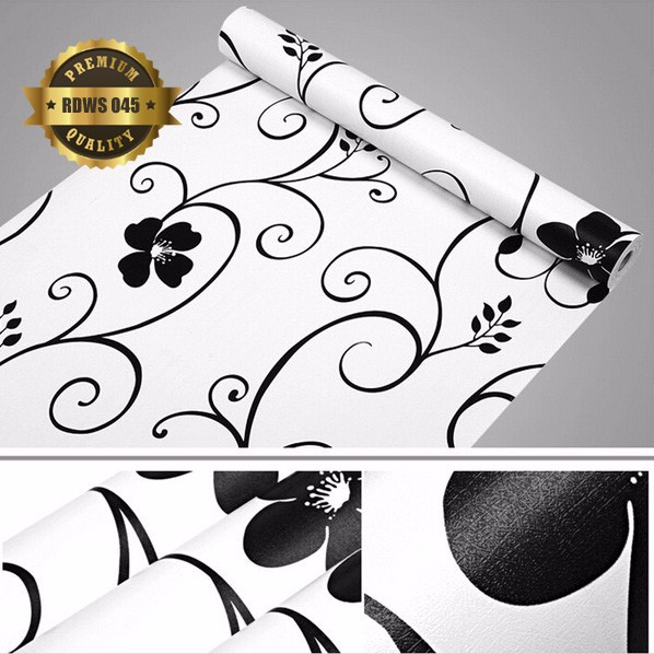 Wallpaper sticker dekorasi rumah wps073 walpaper dinding batik hitam putih bunga termurah.
